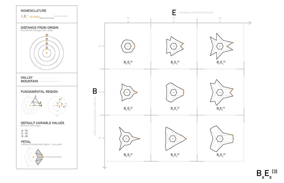 To begin our explorations with origami, we developed a system of variables in Grasshopper to develop iterations. Each petal is based on a fundamental region comprised of 5 different variables, then rotated using a polar array to generate the triple petal shape.